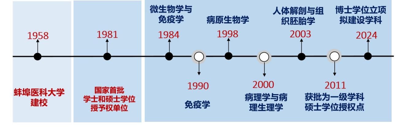 基础医学学科建于1958年,1984年开始基础医学招收微生物学与免疫学专业硕士研究生,1990年免疫学、1998年病原生物学、2000年病理学与病理生理学、2003年人体解剖与组织胚胎学等相继获批硕士学位授权点。2011年基础医学获批为一级学科硕士学位授权点,2024年被列为博士学位立项建设学科。