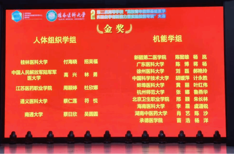 10月24至27日,第二届高等学校“青年教师基础医学实验教学创新能力暨实验技能专项”总决赛在桂林医科大学顺利落幕。我校基础医学院黄丽、叶红伟老师团队凭借扎实专业功底、创新教学设计与出色现场展示,从全国多所高校选手中脱颖而出,斩获总决赛机能组金奖,为校争光。