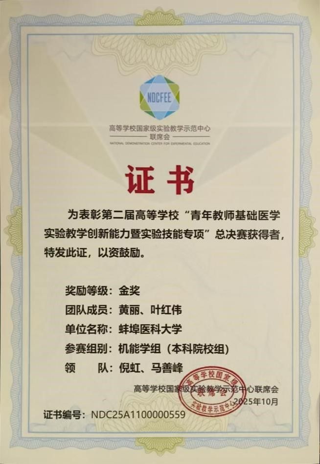 教务处和基础医学院高度重视本次大赛,在赛事组织和技能培训等方面做了周密安排,为比赛顺利进行提供了有力保障。近年学院始终以师资队伍建设为提升教学质量的核心抓手,通过开展教学技能竞赛、组建教学创新团队、搭建校企合作实践平台等举措,持续提升青年教师教学能力与专业素养。此次金奖不仅是学院师资建设成果的生动印证,更为全院教师树立了鲜明标杆。未来,学院将继续深化基础医学实验教学改革,推动更多优质教学成果落地,为培养高素质医学人才贡献力量。