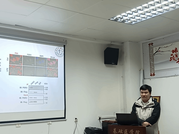 11月7日下午,基础医学院在学院会议室顺利举行“强基论坛”第三讲。本次论坛特邀微生物学教研室陈小亭博士分享上海交通大学医学院进修访学经验,并邀请生理学教研室丁昭博士以“生物钟蛋白PER2驱动的巨噬细胞Gys1转录调控肠道炎症及直肠脱垂发病机制”为题进行专题汇报。论坛由基础医学院院长杨小迪主持,并邀请宋传旺教授、王大鹏教授和王居平教授担任研讨专家。基础医学院部分师生代表参加本次论坛。